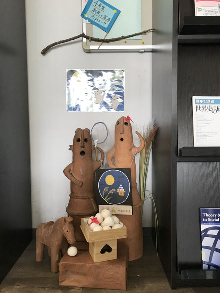 まだまだ暑い日がつづいてますが、もうすぐ夏休みもおわり・・。 はにわも十五夜バージョンになりました。少しずつ秋が近づいていますね。